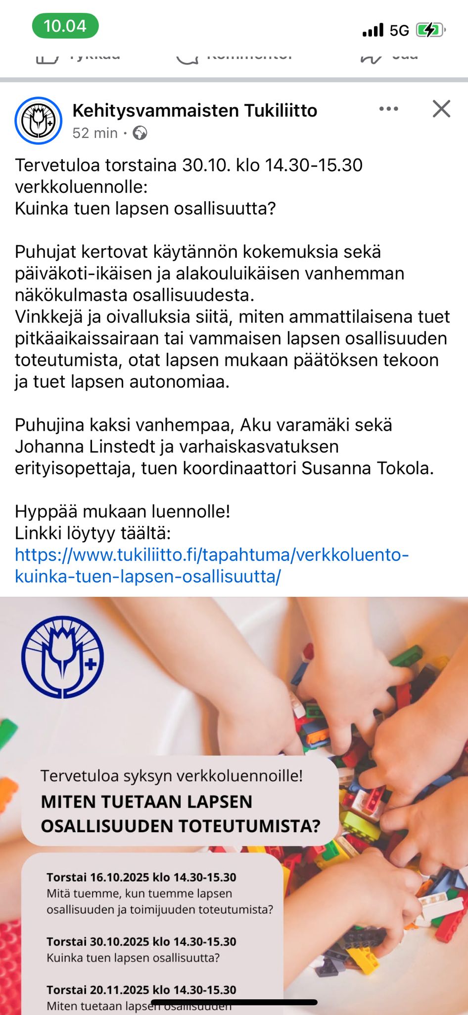 Tässä linkki tapahtumaan: https://www.tukiliitto.fi/tapahtuma/verkkoluento-kuinka-tuen-lapsen-osallisuutta/ Liitteet